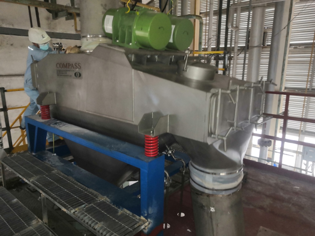 与部分聚合物装置采用了美国的粉料振动筛相比,康柏斯工艺定制设计的粉料振动筛能耗小、振幅低、物料通过快,维修部件极少且非常容易,检修口的设计安排也极其人性化,极大程度地方便操作维护人员。尤其是康柏斯工艺定制设计的粉料振动筛设备高度非常低,空间占用小,通常能够为业主的生产装置节省一个楼层高度的巨大投资和长期运行能耗,因此也被部分业主和设计院联合报送为节能应用新型技术改进措施。