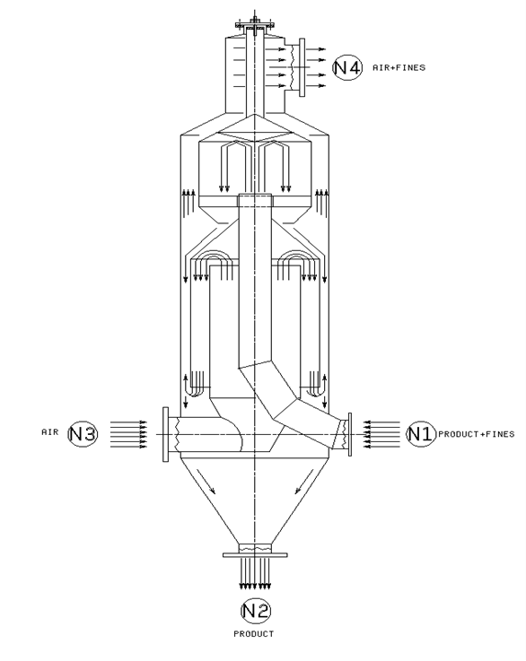 Conventional Elutriator / Pellet Cleaner works rather on removing dust than streamers. For a typical dust content 2000ppm, the conventional Elutriator has a dust separating efficiency up to maximum 90% ~ 95% which means the end product dust content would remain at 100ppm ~ 200ppm or above.